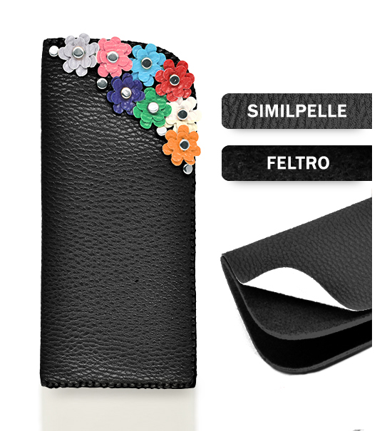Kit fai-da-te “Creative kit” per realizzare astuccio portaocchiali in similpelle e feltro di colore nero busta contente: sagoma di feltro base, sagoma di similpelle base, matassina di filo, applicazioni varie.