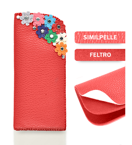 Kit fai-da-te “Creative kit” per realizzare astuccio portaocchiali in similpelle e feltro di colore rosso busta contente: sagoma di feltro base, sagoma di similpelle base, matassina di filo, applicazioni varie.