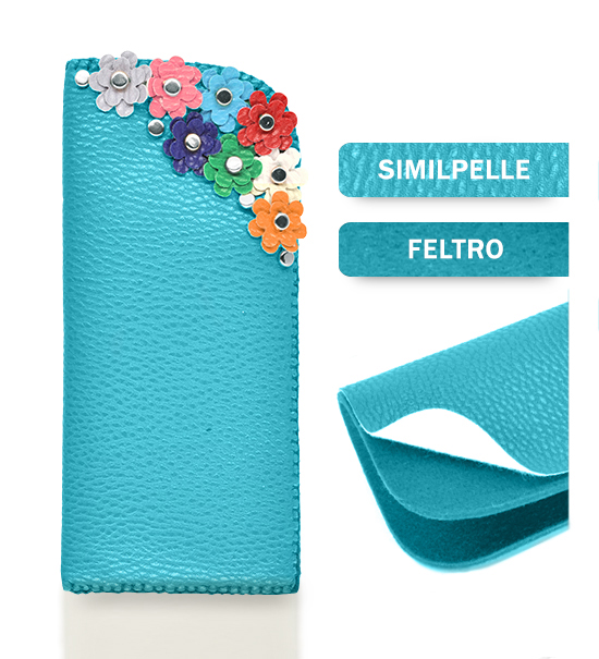 Kit fai-da-te “Creative kit” per realizzare astuccio portaocchiali in similpelle e feltro di colore turchese, busta contente: sagoma di feltro base, sagoma di similpelle base, matassina di filo, applicazioni varie.