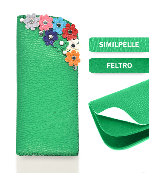 Kit fai-da-te “Creative kit” per realizzare astuccio portaocchiali in similpelle e feltro di colore verde, busta contente: sagoma di feltro base, sagoma di similpelle base, matassina di filo, applicazioni varie.